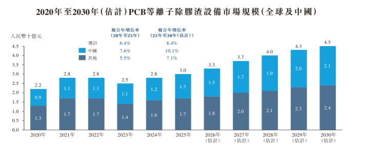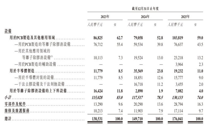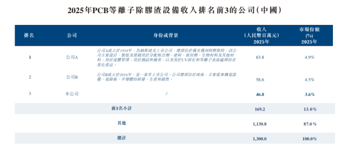 凭据弗若斯特沙利文论说,按2023年至2025年各年于中国产生的收入计,公司在中国PCB等离子除胶渣设备商场排行前三。按2025年于中国产生的收入计,公司在中国PCB等离子惩处设备的商场份额约为3.6%。