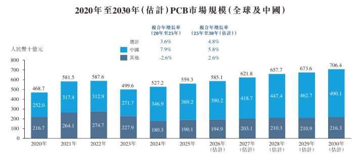 中国PCB商场由2020年的东说念主民币2,520亿元加多至2025年的东说念主民币3,692亿元,期内复合年增长率为7.9%。该商场测度将以5.8%的复合年增长率增长,并于2030年达到东说念主民币4,901亿元。