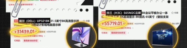 在露馅器方面,戴尔的 UP3218K,价钱也来到了 31500 元,新华三的 8K 会议云屏,价钱也超越了 55000。