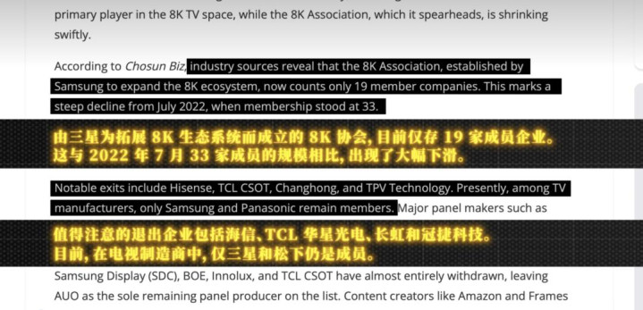 更惨的是,阿谁三星拓展 8K 生态的协会,TCL、海信也示意莫得出路,照旧退群 。