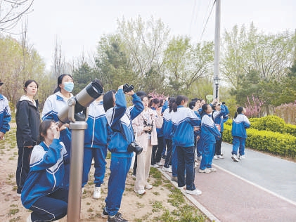北京市第十二中学学生在庄怡乐学公园开展不雅鸟活动。