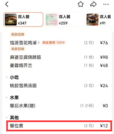 餐位费包含湿纸巾、餐具消毒等用度,只消在店内用餐就得交。