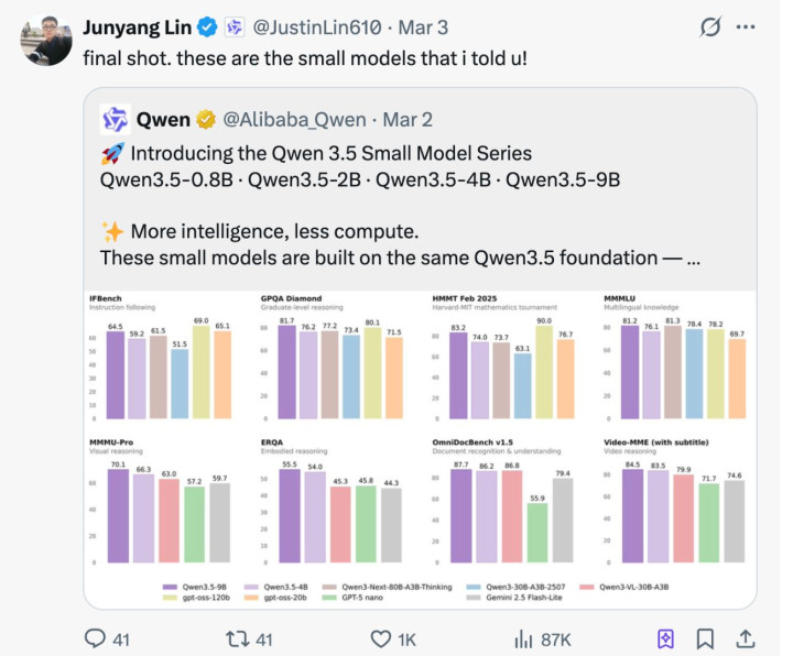 3月3日,林俊旸文书离开Qwen前的最新一条X推文是转发Qwen;3.5系列的小模子。跟着下野事件的计划加多,多有不雅点以为阿里Qwen往常将有可能从开源转为闭源模子,而开源模子则更稳当小模子腹地部署的端、边际侧场景。这背后是阿里巴巴对于AI畛域的举座买卖化念念考。