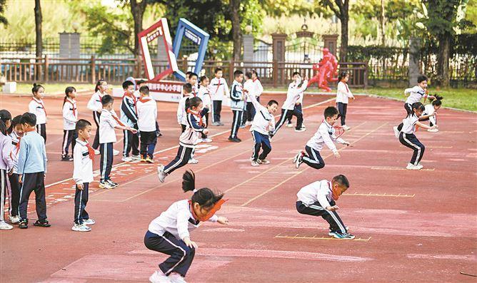 下课了,祥平中心小学四年纪学生吉睿迫不足待地从二楼教室来到操场,和同学们比赛跳远,不已而就蹦出了汗。