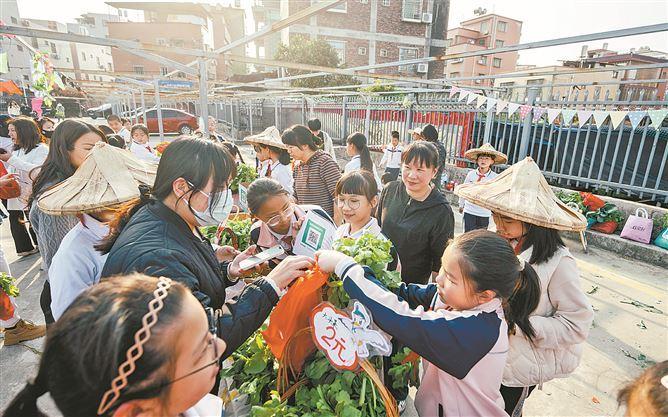 校园菜地里的蔬菜成绩后,学校组织“校园赶圩”行径,让学生们在校门口体验摆摊卖菜。